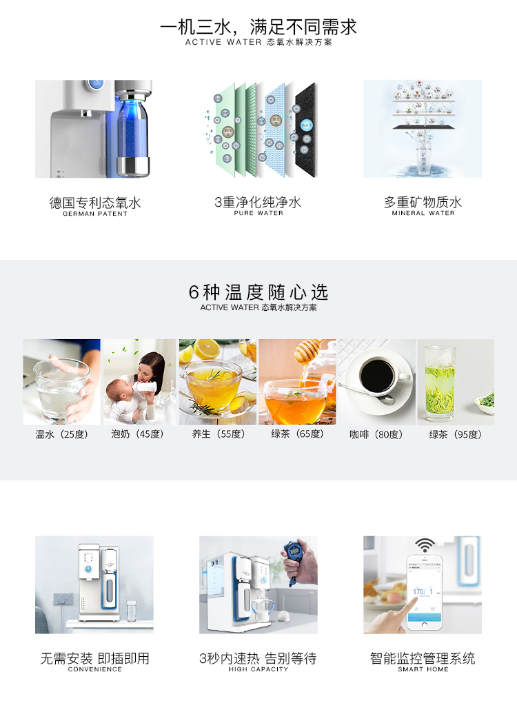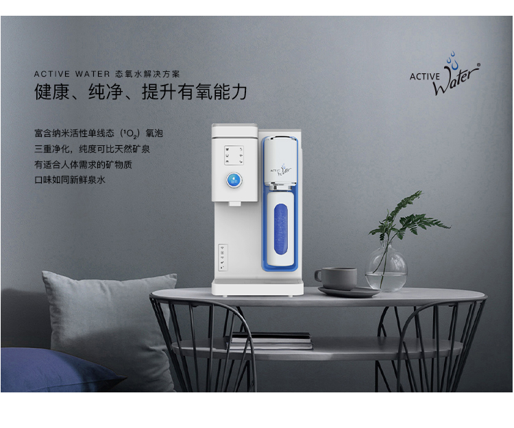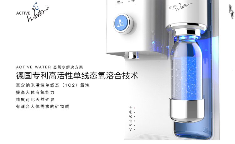 德国专利技术单线态氧水设备,它极大提高人体有氧能力。 艾云泉态氧水设备可生成三种水:纯净水、矿物质水切换:独特水路设计,一机三水(纯净水、矿物质水、态氧能量水),满足不同需求。