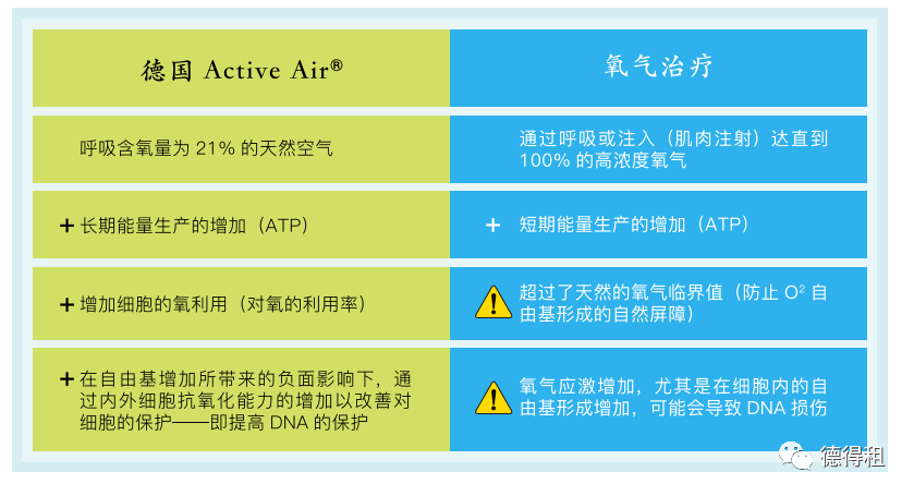 相对于其它氧疗,德国 Active Air 不增加氧气的供给,而是优化了利用率,从而为细胞提供能量。