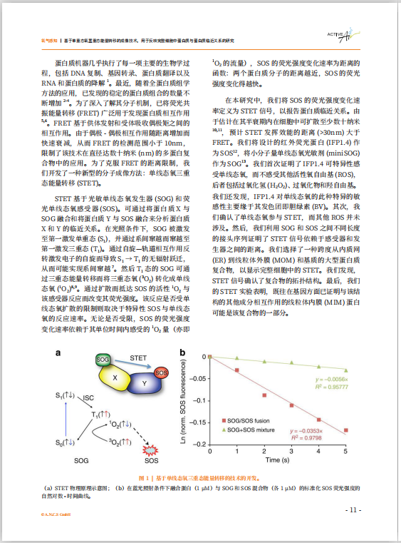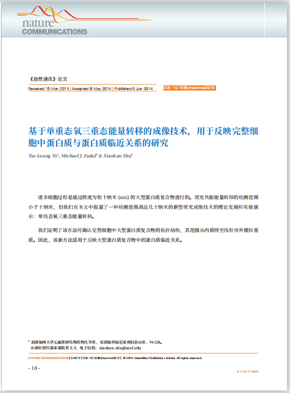 在近日刊发的《氧气感知》论文集中收录了国际顶级期刊《自然(Nature)》子刊《自然通讯 (Nature Communications)》发表的美国加州大学心血管研究所的一篇长达12页的研究论文。论文题目为《基于单重态氧三重态能量转移的成像技术,用于反映完整细胞中蛋白质与蛋白质临近关系的研究》。这篇论文报道了一种检测范围高达几十纳米的新型荧光成像技术的理论发展和实验演示:单线态氧三重态能量转移。