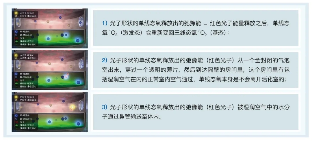 德国Active Air 模拟光合作用,将自然状态的氧气激发成单线态氧状态。在此过程会释放出生物光子,为生物细胞吸收利用。并将生物光子能量储存于水蒸气分子中,通过呼吸把能量吸入人体,由血液循环作用供给到人体各部位细胞,给细胞线粒体提供更多的能量。