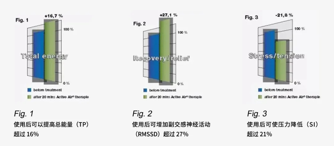专家曾做过一项研究[1],选取37名23-83岁(平均年龄52岁)的慢性心脑血管、糖尿病患者,在使用Active Air 20分钟前后作对比,数据显示:总能量提升16.7%,副交感神经活动增强27.1%,压力降低21.8%。数据证实了其调节功效,提高了人体监管系统的效率,这种监管效率归因于能量和代谢资源的激活结合体内压力的平行减少以及自主神经系统的协调作用。